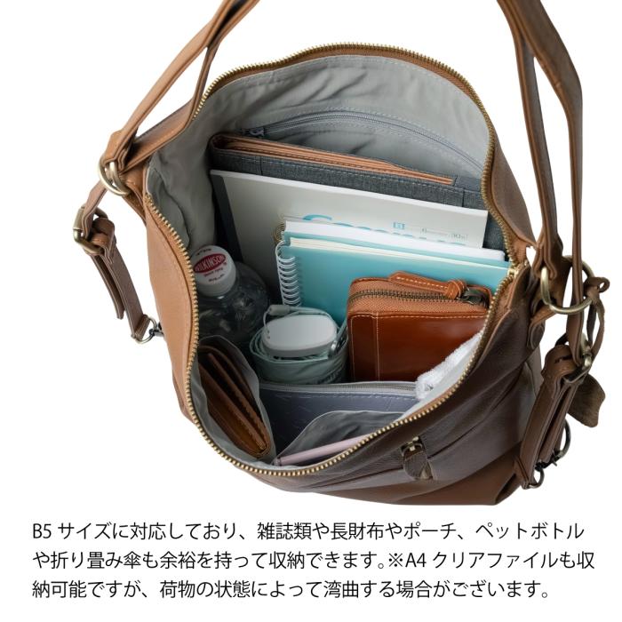 B5サイズに対応しており、雑誌類や長財布やポーチ、ペットボトルや折り畳み傘も余裕を持って収納できます。※A4クリアファイルも収納可能ですが、荷物の状態によって湾曲する場合がございます。