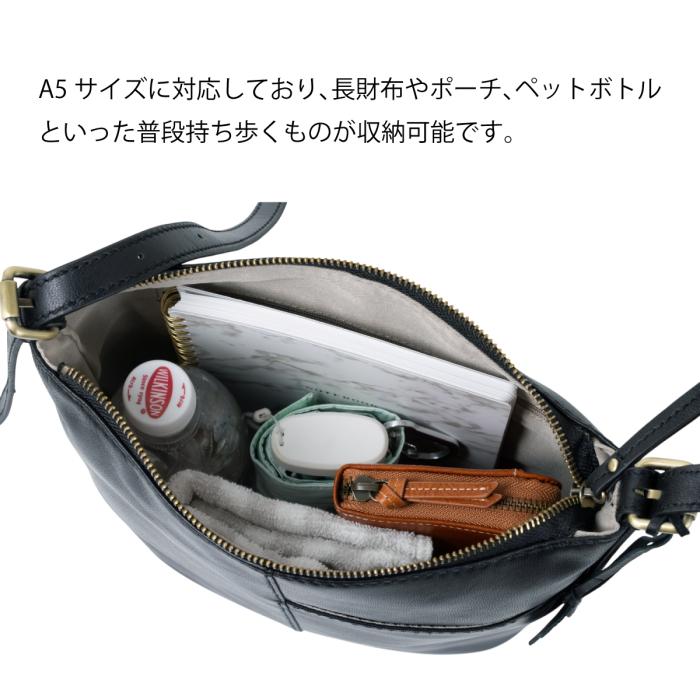 A5サイズに対応しており、長財布やポーチ、ペットボトルといった普段持ち歩くものが収納可能です。