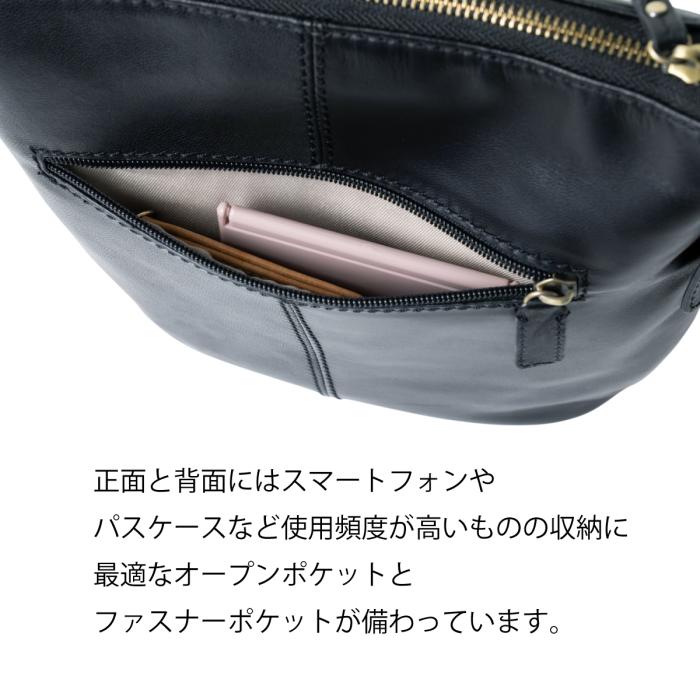 正面と背面にはスマートフォンやパスケースなど使用頻度が高いものの収納に最適なオープンポケットとファスナーポケットが備わっています。