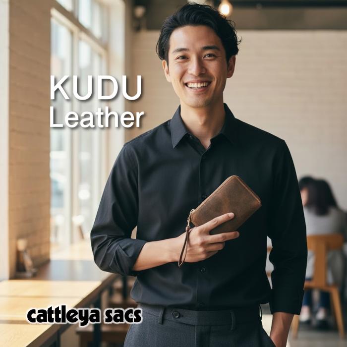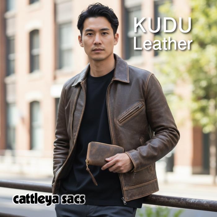 自然で育まれた野生特有の「荒々しさ」と「美しさ」を兼ね備えたクーズーレザーはナチュラルな風合いと革の奥深さをがあり、長く使えば使うほどより特別な表情を魅せてくれます。