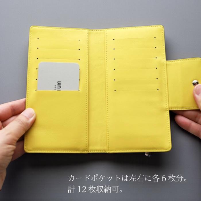 ビビッドなイエローのフラップがワンポイントの二つ折り長財布。
