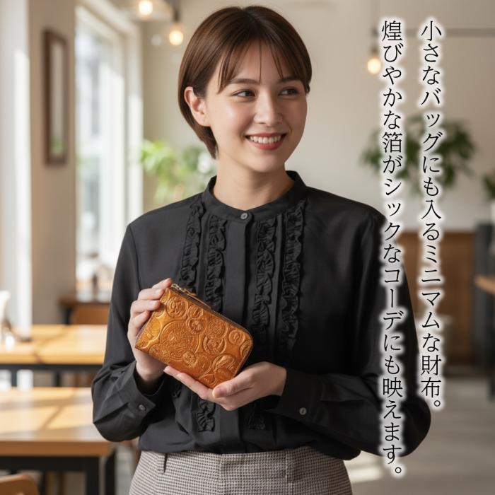 牛革にレトロ感のあるコイン柄と煌びやかな箔が特徴のお財布シリーズ