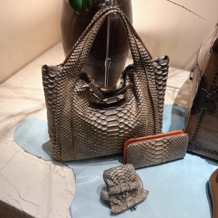 ダイヤモンドパイソンという、きれいなウロコが特徴の大ヘビに、少しムラのある加工を施すことで、アンティーク調の風合いを表現しています。
