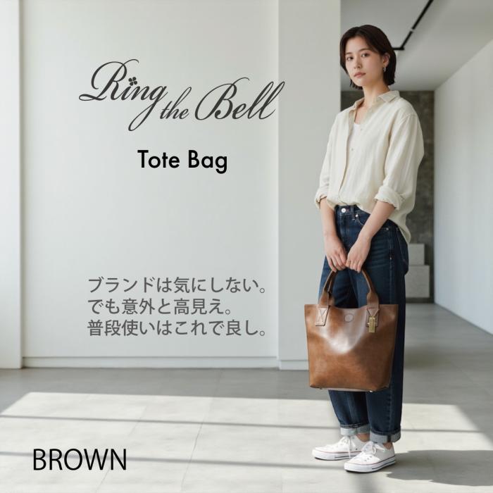ブラウンのトートバッグは定番スタイル。
