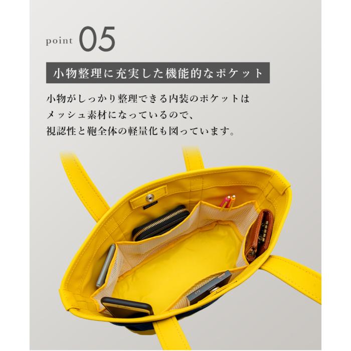 小物がしっかり整理できる内装のポケットはメッシュ素材になっているので、視認性と鞄全体の軽量化も図っています。